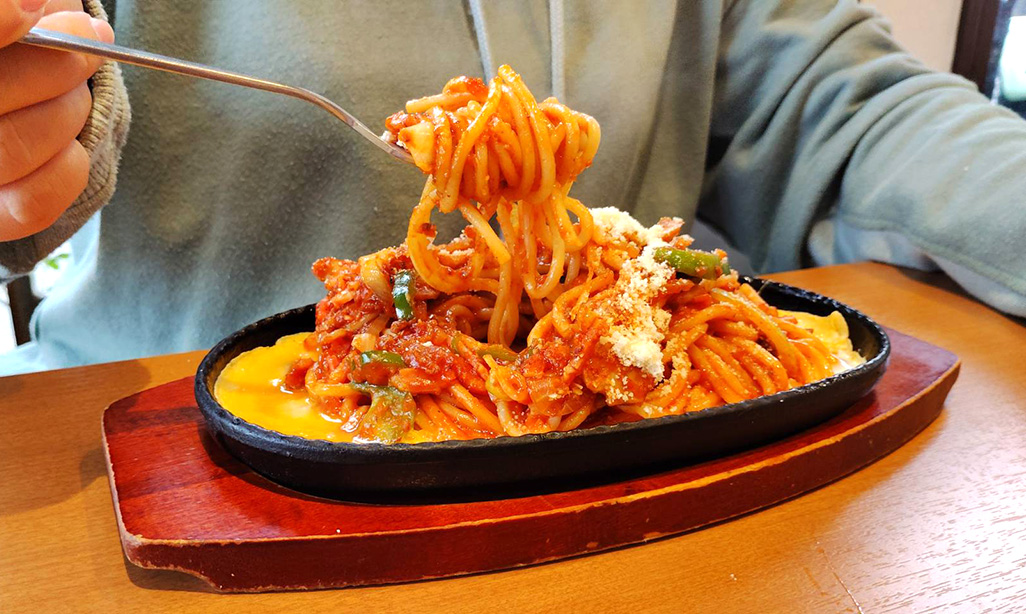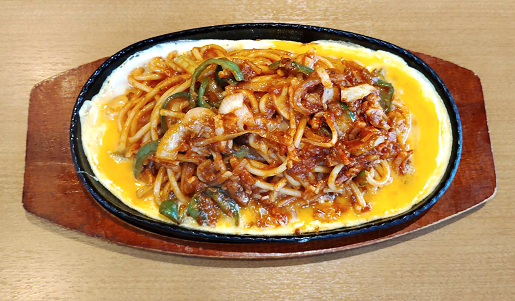 まず運ばれてきたナポリタンは、鉄板の上で熱々のまま登場。ケチャップの香ばしさとともに、玉ねぎやピーマンの彩りが食欲をそそります。
