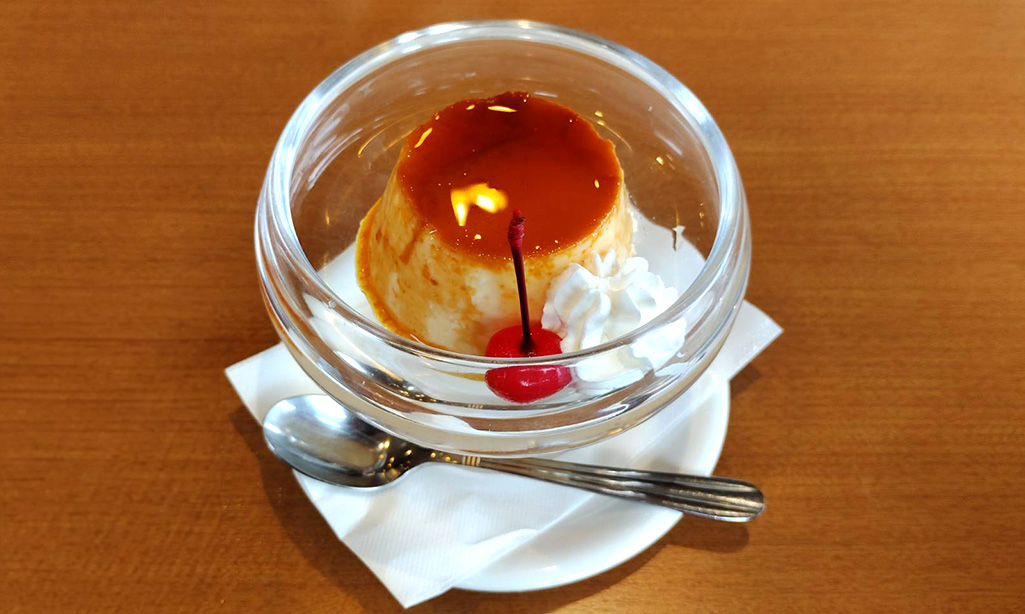 固めに仕上げられたプリンは、卵の風味がしっかりと感じられるクラシックタイプ。ほろ苦いカラメルが全体を引き締め、シンプルながらも奥深い味わいです。