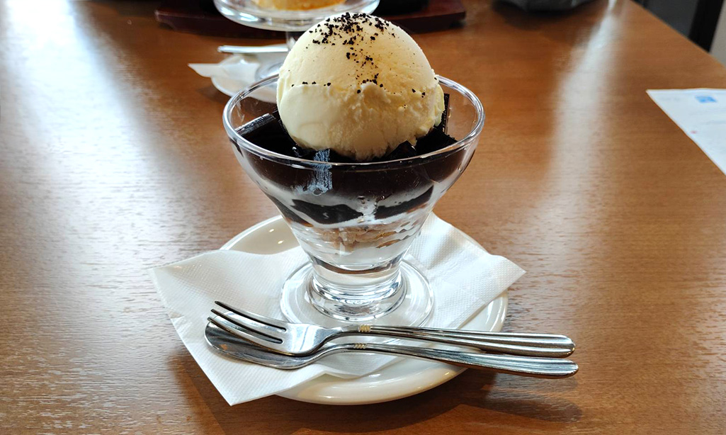 コーヒーゼリーにはバニラアイスが添えられ、ほろ苦さと甘さのバランスが絶妙。口の中で溶けるたびに、幸せな余韻が広がります。