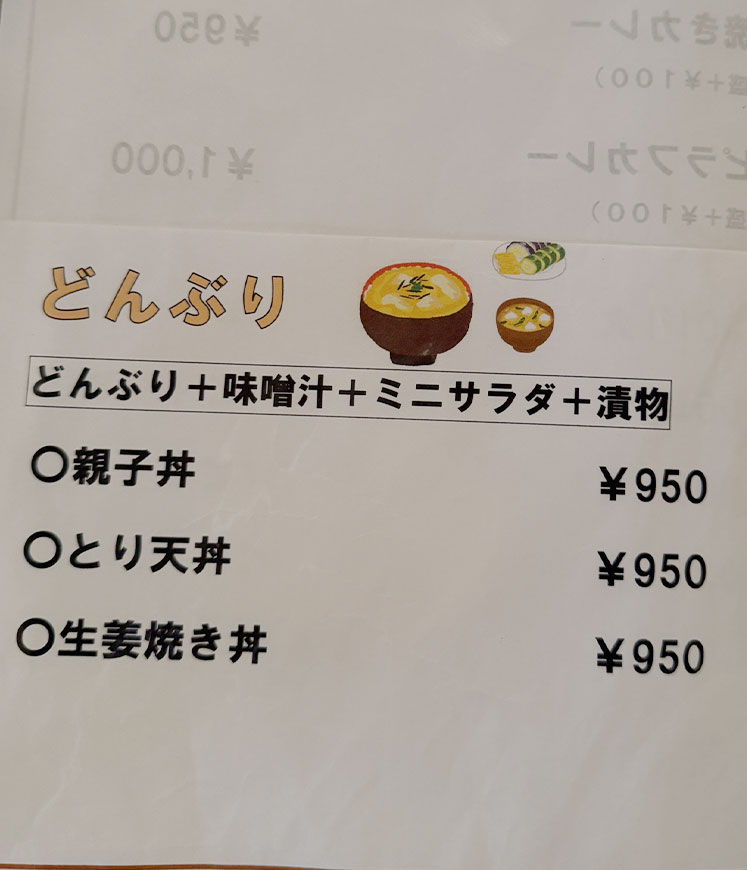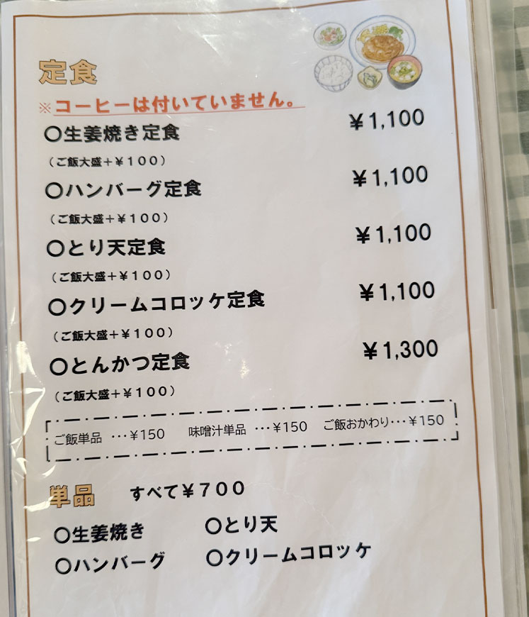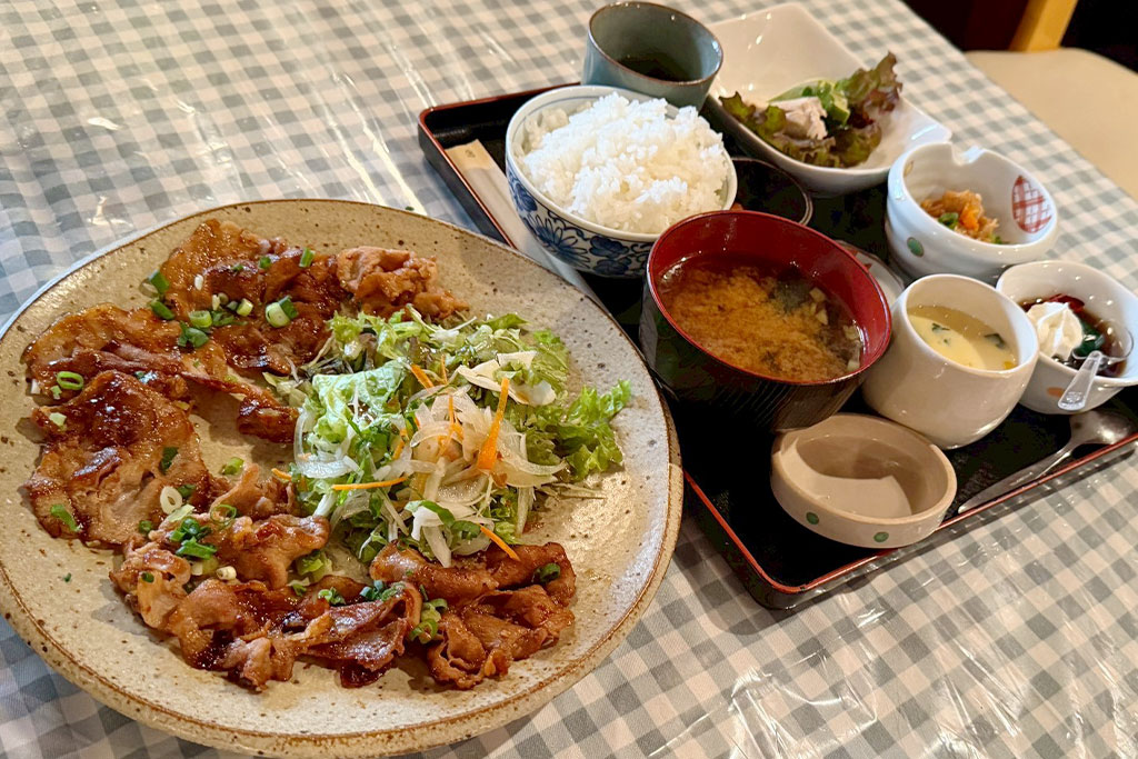 人気の定食メニューは、ハンバーグやとり天、しょうが焼きなど、家庭の味を思わせるラインナップ。ごはん・味噌汁・小鉢・茶碗蒸し・デザートまで付いた満足度の高い内容で、ボリュームも十分です。