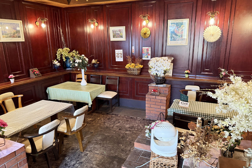 木を基調にした家具、チェック柄のテーブルクロス、そして少し落ち着いた照明が、昭和レトロな雰囲気が漂う心地よい喫茶店です。
