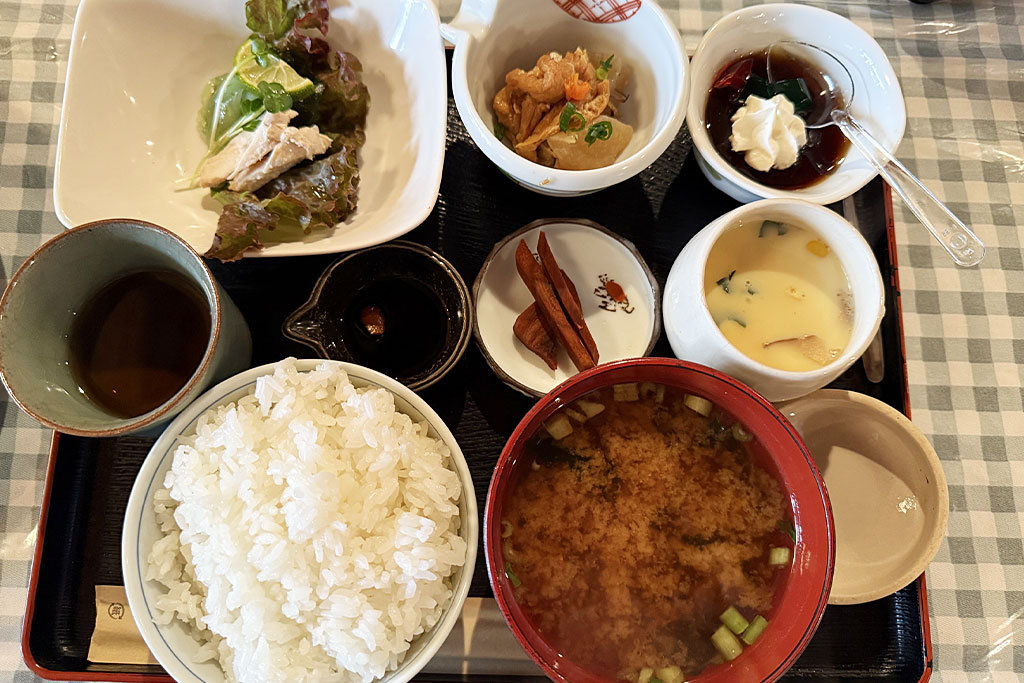 トレーには、ご飯・味噌汁・小鉢・サラダ・茶碗蒸し・コーヒーゼリー。