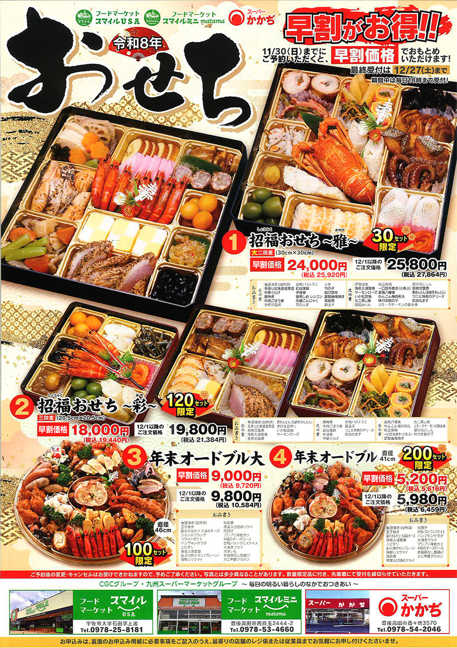 宇佐市で大人気のスーパー、フードマーケットスマイルUSAさんのおせちは『大二段重~雅~』、『三段重~彩~』の2種類。