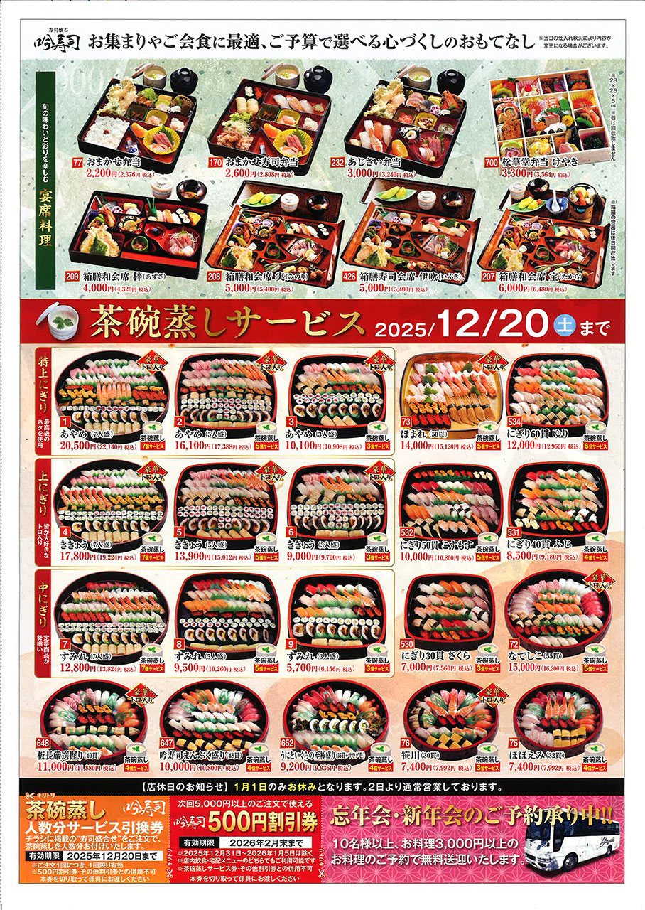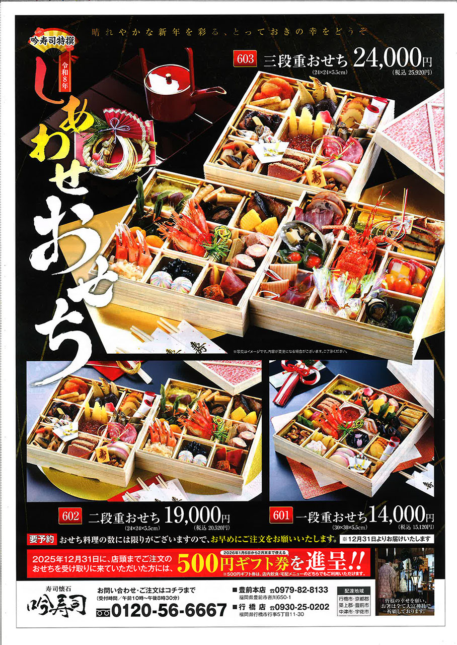 豊前市の吟寿司さん。毎年大好評のおせちは三段重、二段重、一段重の全3種類です。