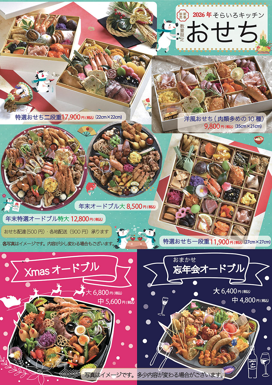 そらいろキッチンはもちろんクリア、さらに、洋風おせちや少人数で食べられるおせちなどもご用意しています。