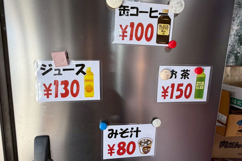 メニュー表が新しくなっています。お茶やみそ汁、カップ麺なども販売しているため、これからの季節は温かい一品をプラスできるのも嬉しいポイント。