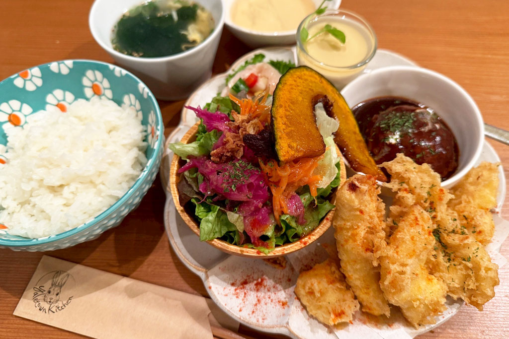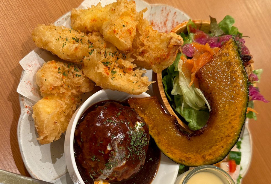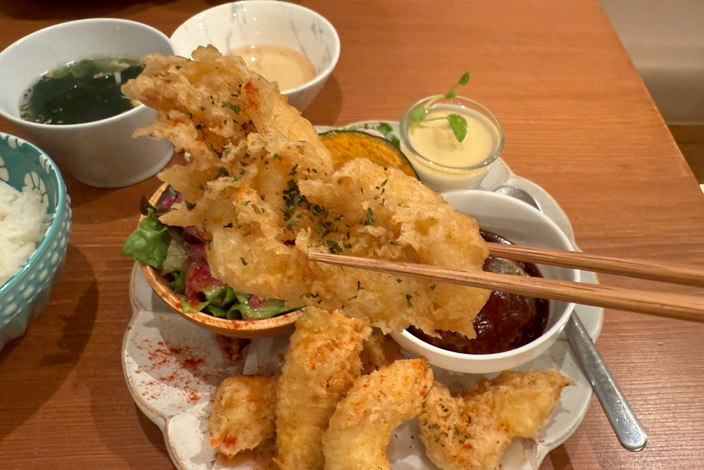 こちらは鶏天とデミグラスハンバーグの組み合わせ。