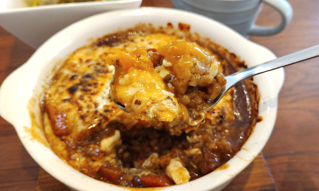 スプーンを入れると、カレーと半熟卵、そして香ばしい焼きチーズの香りがふわっと広がります。