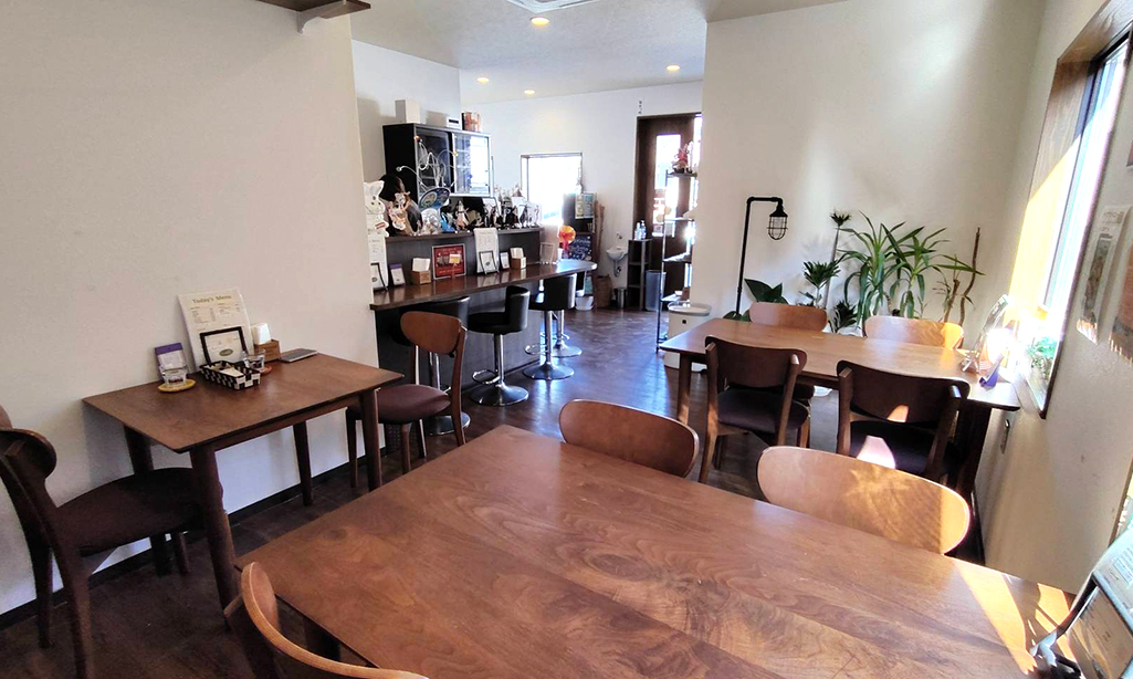 南部小学校体育館の近くにあるこちらのお店は、木の温もりに包まれた落ち着いた空間で、まるで誰かの家に遊びに来たようなほっとする雰囲気が魅力です。