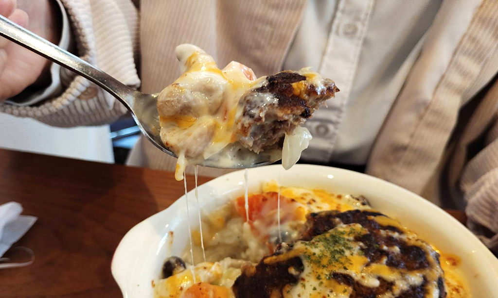 スプーンを入れた瞬間、ハンバーグ・クリーム・ごはんが一体となってとろけるよう…。