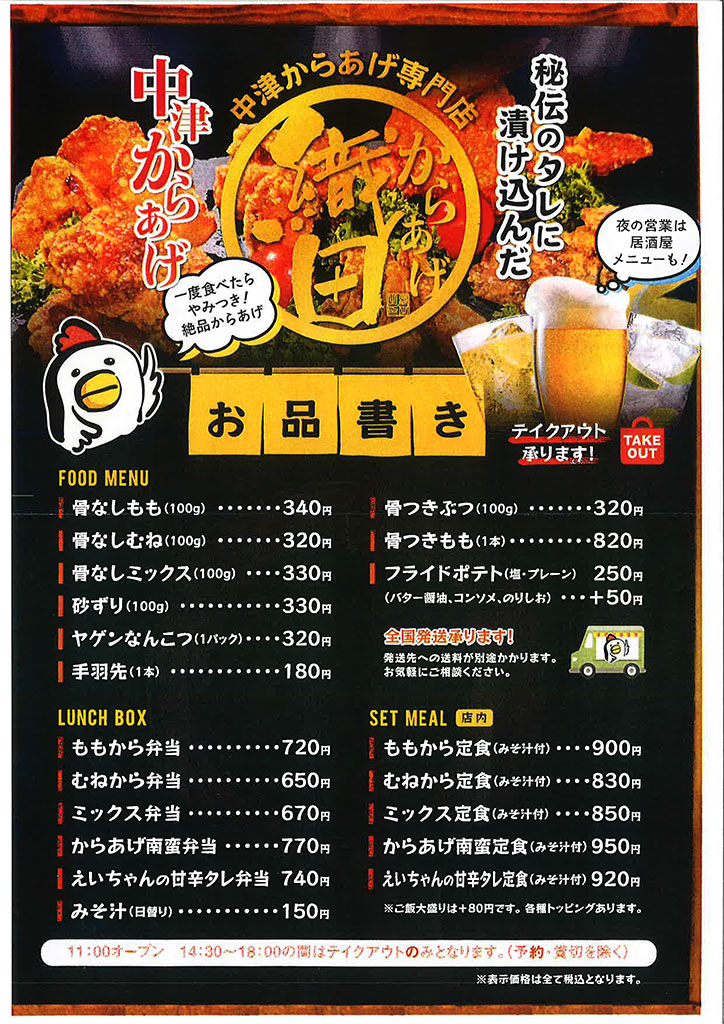 テイクアウトで中津からあげやお弁当、ランチタイムは定食、夜は居酒屋メニューを楽しめるお店です。