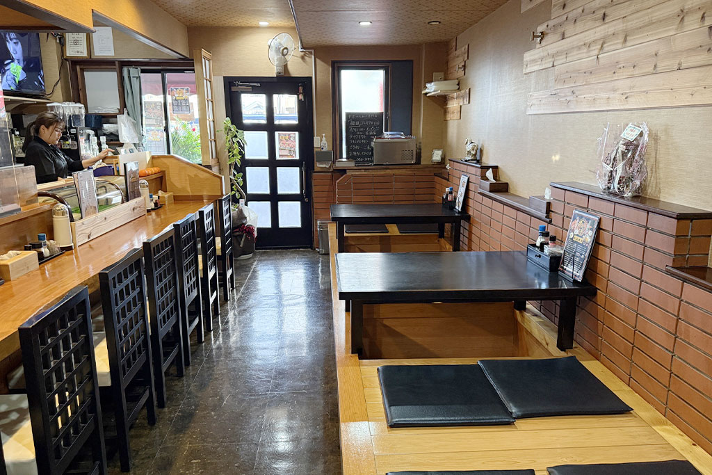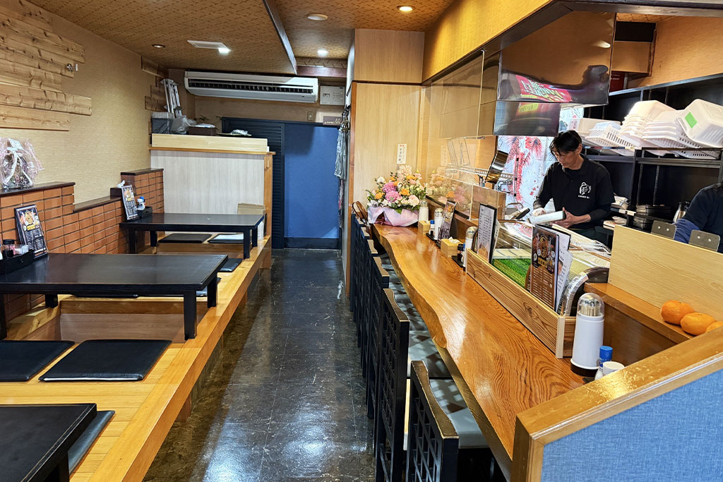 カウンター席は7席、4人掛けの座敷(掘りごたつ式)が3席。