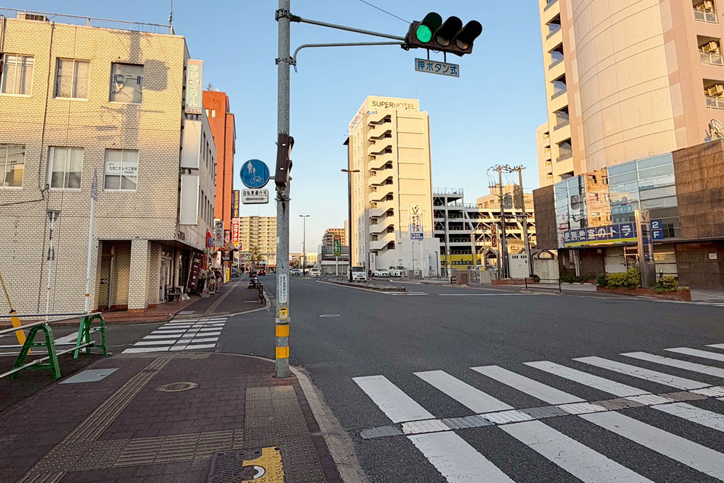 大分銀行中津支店の前を中津駅方面へ進み、最初の信号を左折します。