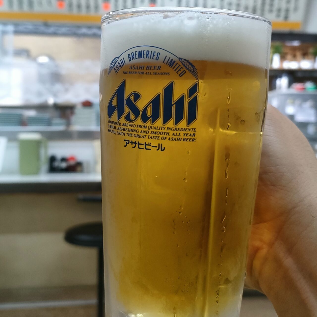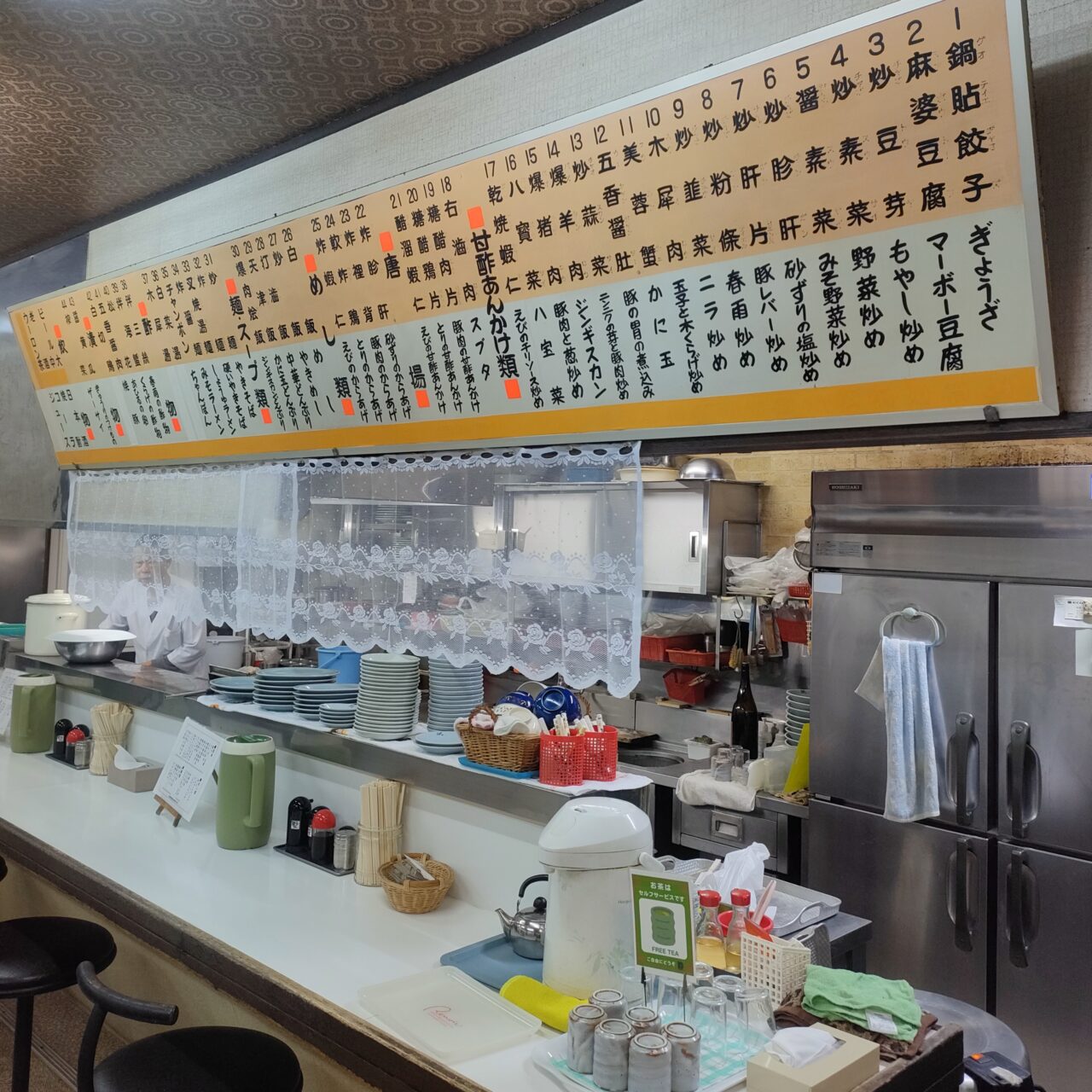 店内には、メニューを記載した一際目立つ大きな1枚ものの看板があり、カウンター席と小上がりのテーブル席があります。