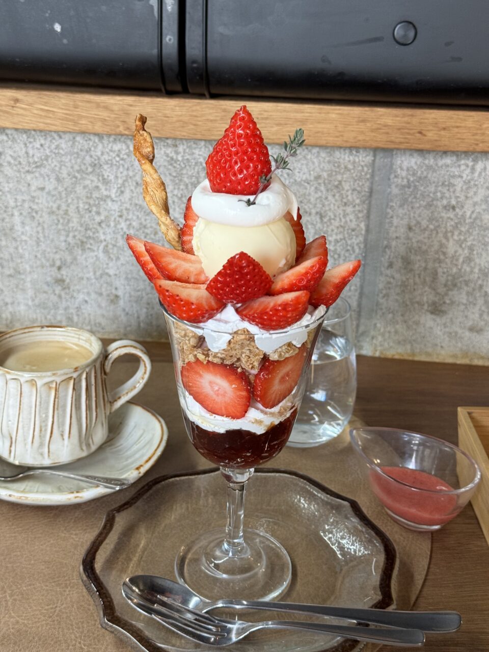 まず苺パフェは、ふんだんに盛られた苺がとにかく華やかで艶やか。