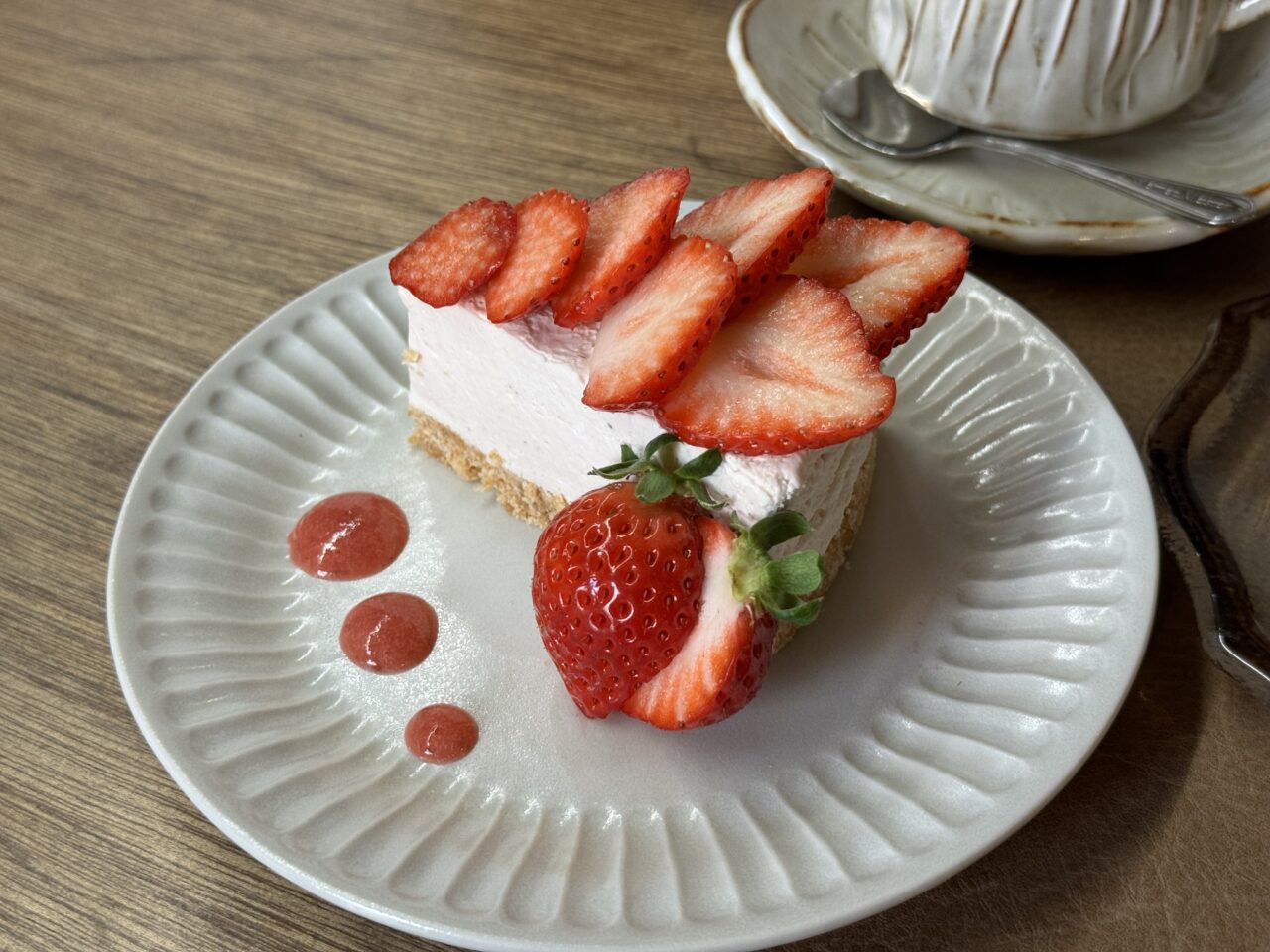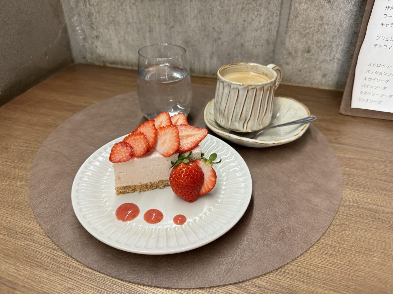 苺のレアチーズケーキは、盛り付けが美しくおしゃれで、見た目も可愛い一品。