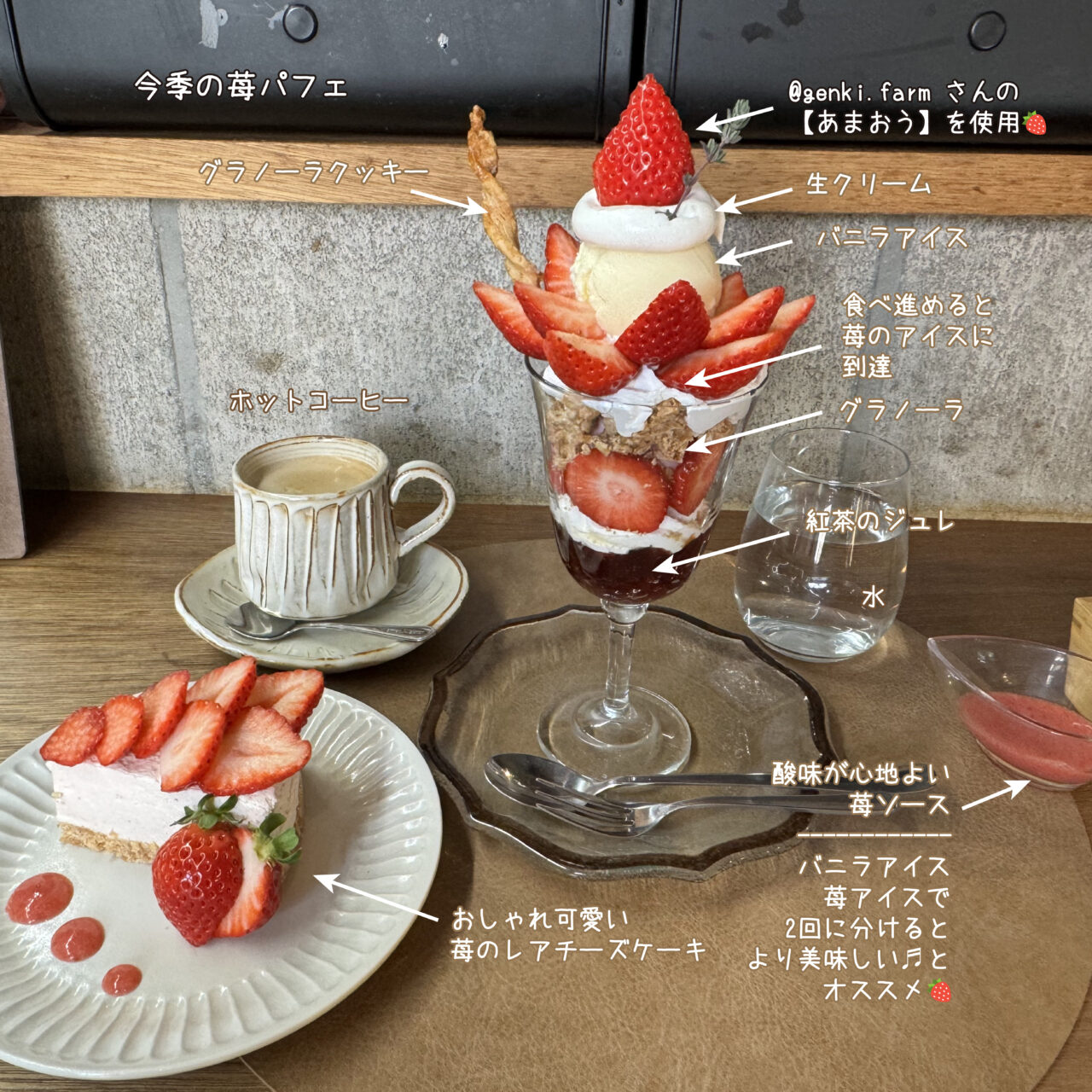 今回のお目当ては、苺の時期限定メニュー。上毛町の元気FARMさんのあまおうを使用した苺パフェ、苺のレアチーズケーキ、そしてホットコーヒーをいただきました。