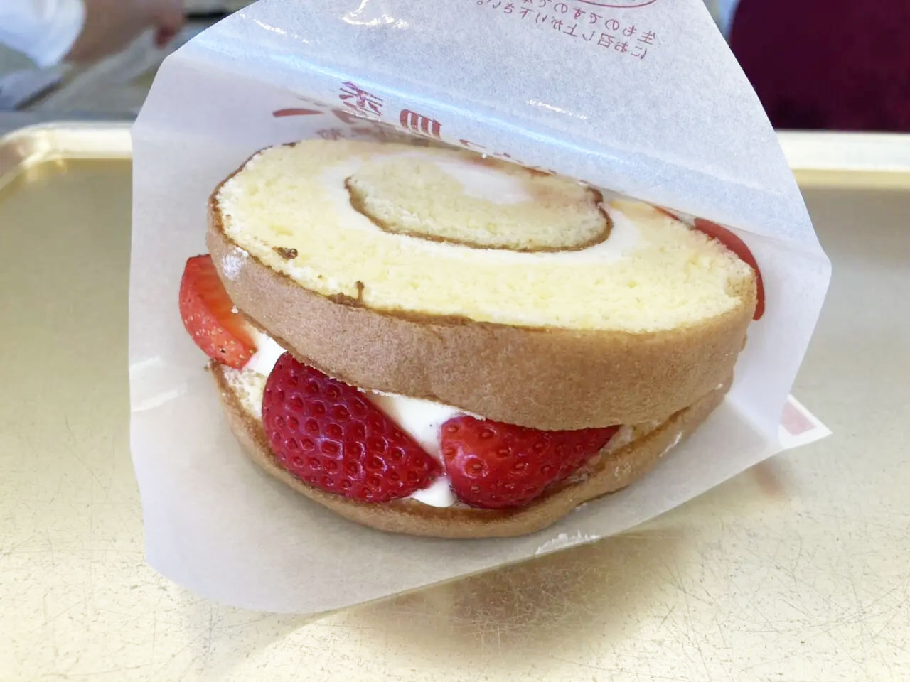 ロールケーキの間にカスタードと苺をつめました。