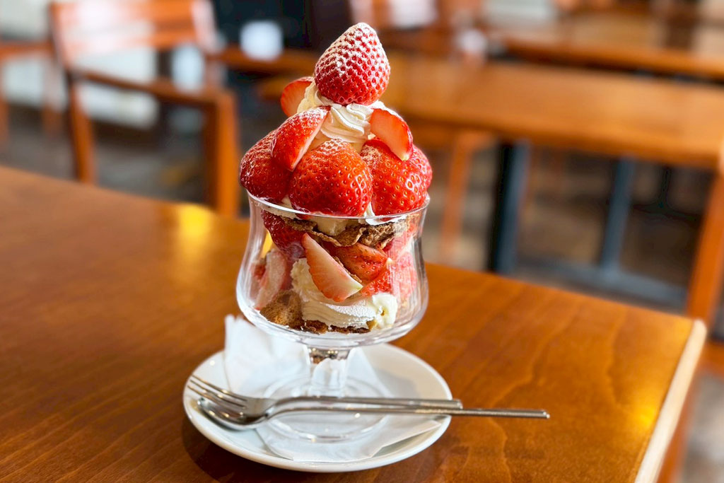 いちごの存在感を存分に楽しめる「MOGI」のいちごパフェは、旬の味わいをまっすぐ堪能できる一品。旬のいちごをしっかり味わいたいときに、立ち寄りたくなるカフェです。