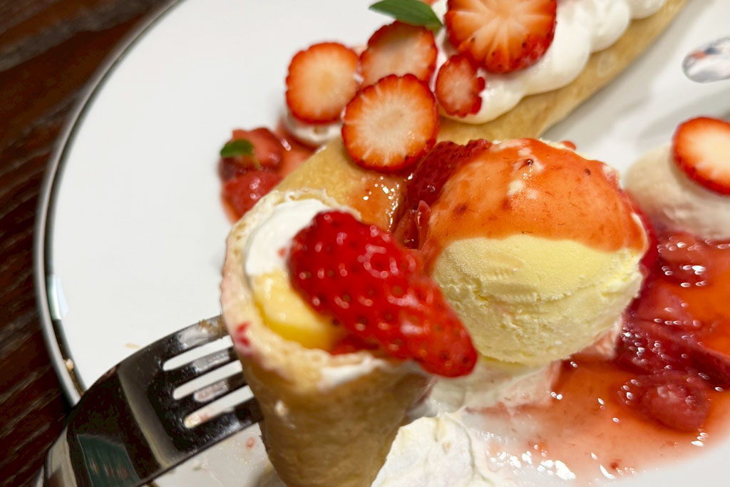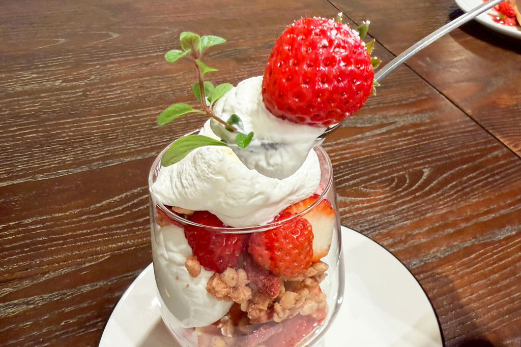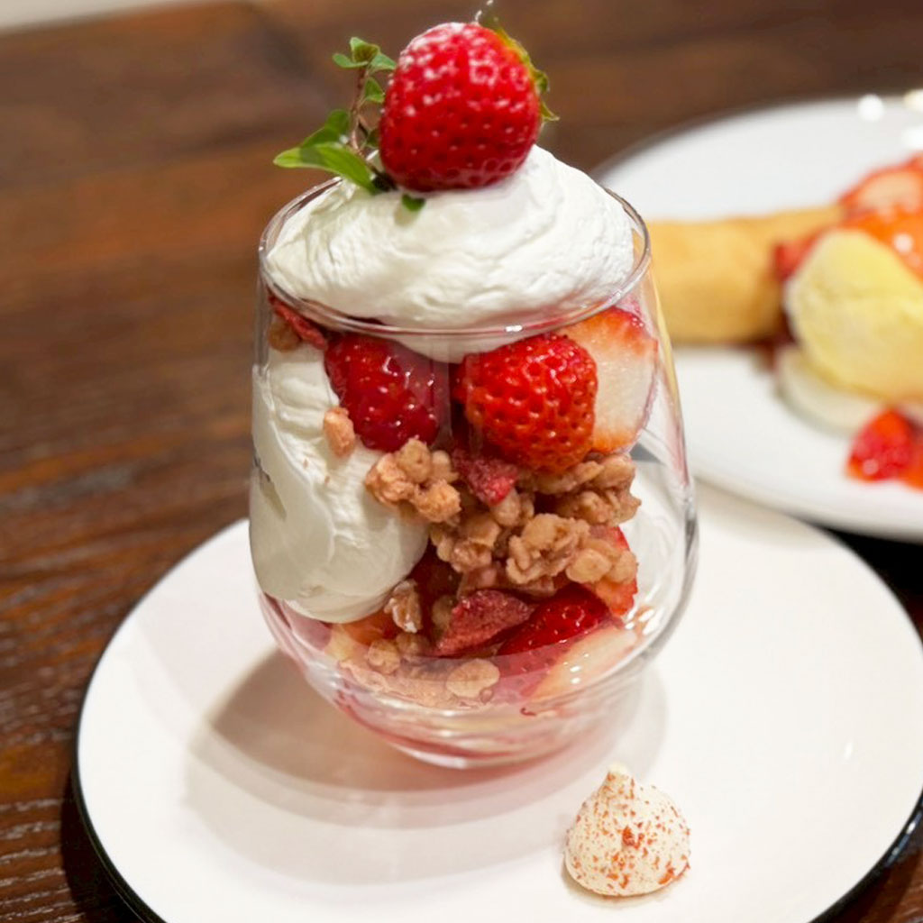 途中に入った苺のグラノーラがザクザクとした食感のアクセントになり、ボリュームはありつつも重たさがなく、食後のデザートとしても満足感の高いパフェでした。