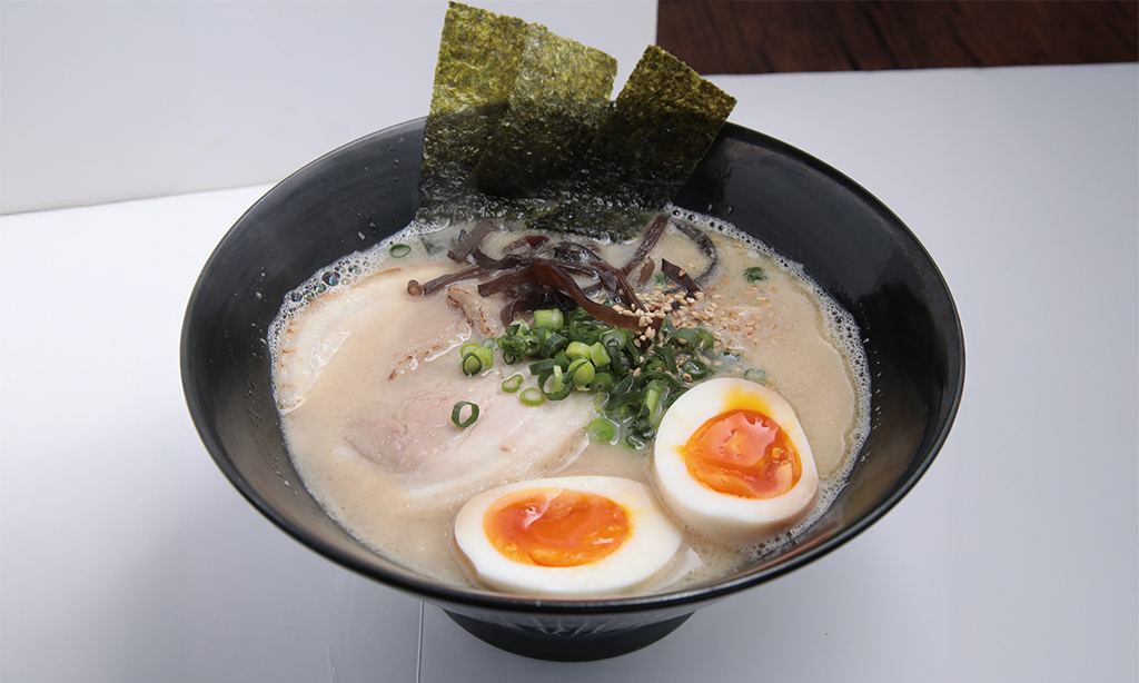 ラーメン好きが高じた店主が、情熱を込めて一から仕込む「自家製ラーメン」が話題!!丸半日(12時間)煮込んだ豚骨スープに合わせるのはストレート麺。ラーメン単品ですと850円。写真のように煮卵プラスでちょうど1,000円です!