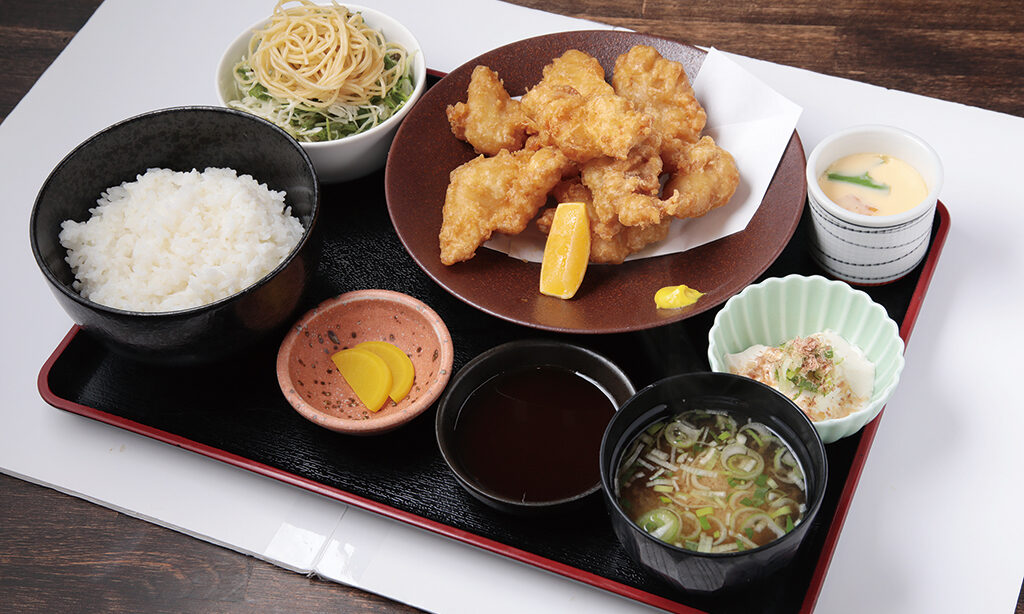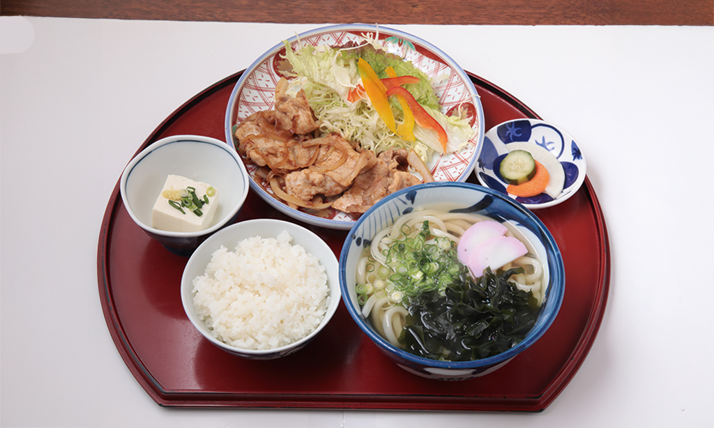 生姜焼き、サクッとジューシーなカツ、唐揚げなど、うどんやの日替わり定食の魅力は、なんといってもやさしいお出汁にぴったり合うおかずのラインナップ。ざるうどんやそばへの変更も別途できる柔軟さもうれしいポイント。