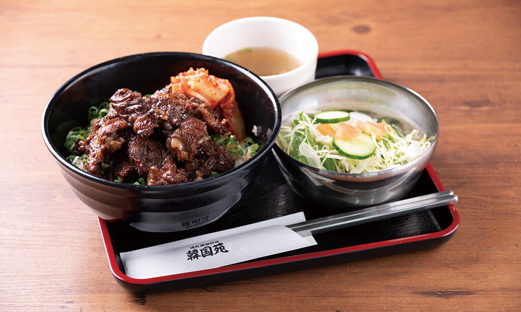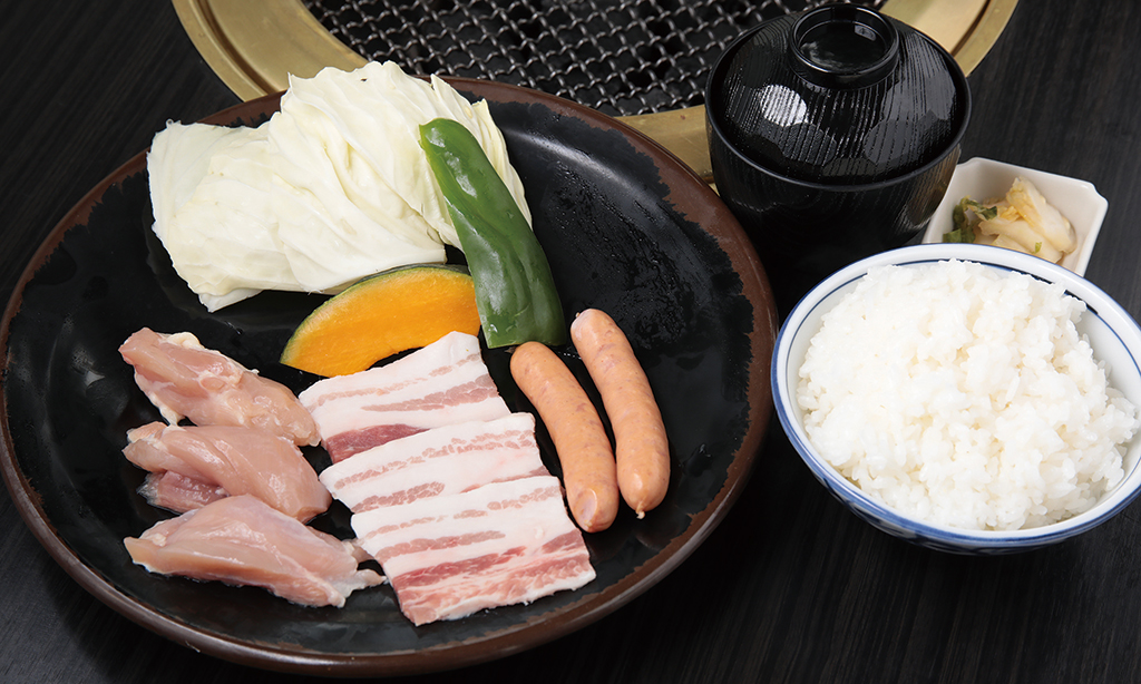 お昼から網を囲み、豚バラ、若鶏モモ、ウインナーと多彩な具材を自分好みにジュ〜と焼く。ちょっと贅沢なひとときが叶うBBQランチが大人気!!味付けは特製タレか塩。どっちにしても白米が止まらない。実は一人焼肉を楽しむ人も多いので、気兼ねなく堪能できます。