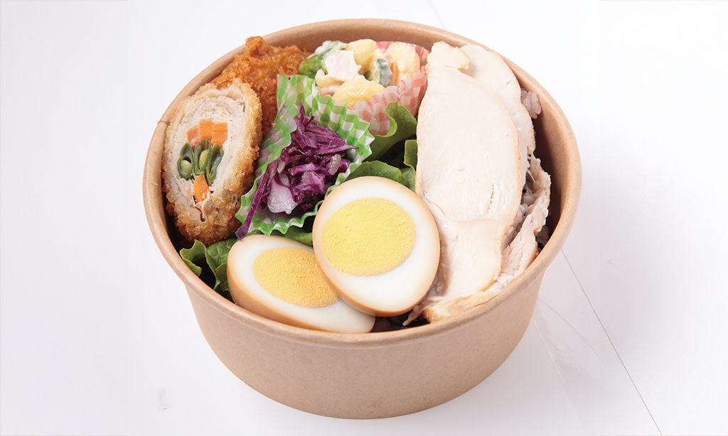 量り売りのバイキングからパック売りに変わって、さらにお得になったデリマートかなえだ。新作のこちらは、梅ひじきご飯の上にしっとり鶏生ハムや煮卵、野菜巻きなど、やさしい味のおかずがギュッと詰まっていて腹持ちも抜群。人気爆発中なのでお早めに!