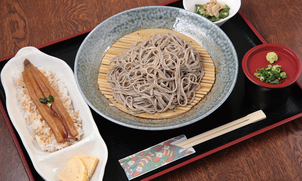 石臼挽き粉100%、阿蘇の天然水で打つ本格十割そば。丼とセットで楽しむなら、一番人気の穴子丼がおすすめ。職人が丁寧に巻く、お出汁たっぷりのだし巻き卵も絶品です。食後は蕎麦湯でホッと一息。