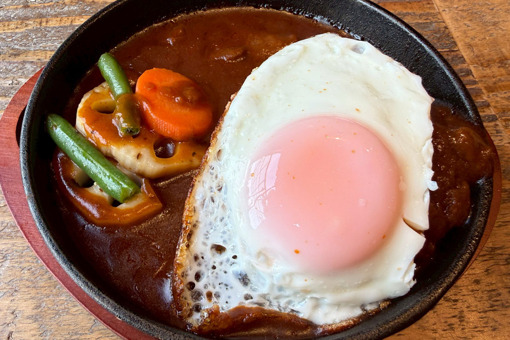 メインのハンバーグは、コクのあるデミソースと卵のまろやかさが合わさり、しっかりとした味わいに仕上がっています。ふわふわのハンバーグに、割った黄身とソースが絡み、ごはんが進む一皿です。