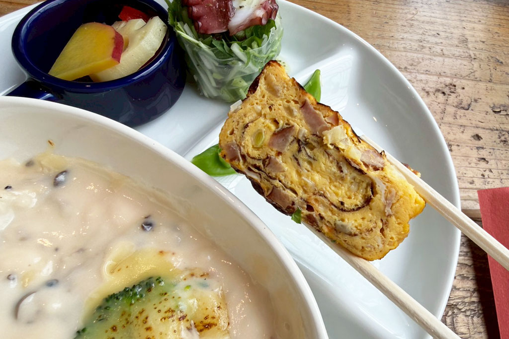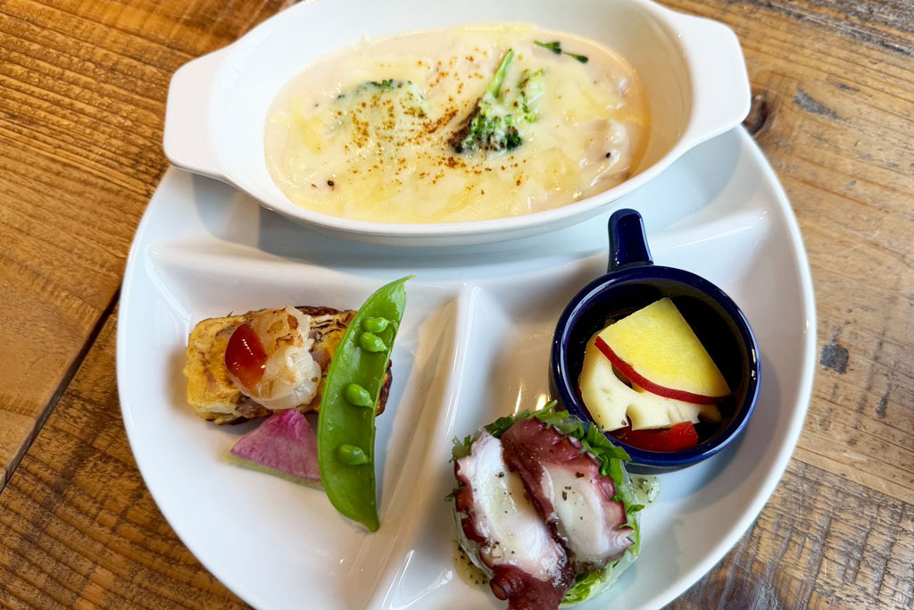 セットで付いてくる前菜は、その日によって内容が変わる5種盛り。この日はグラタンが中心の内容でしたが、少しずついろいろ味わえるのもうれしいポイントです。