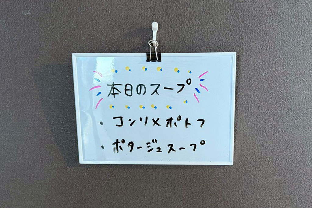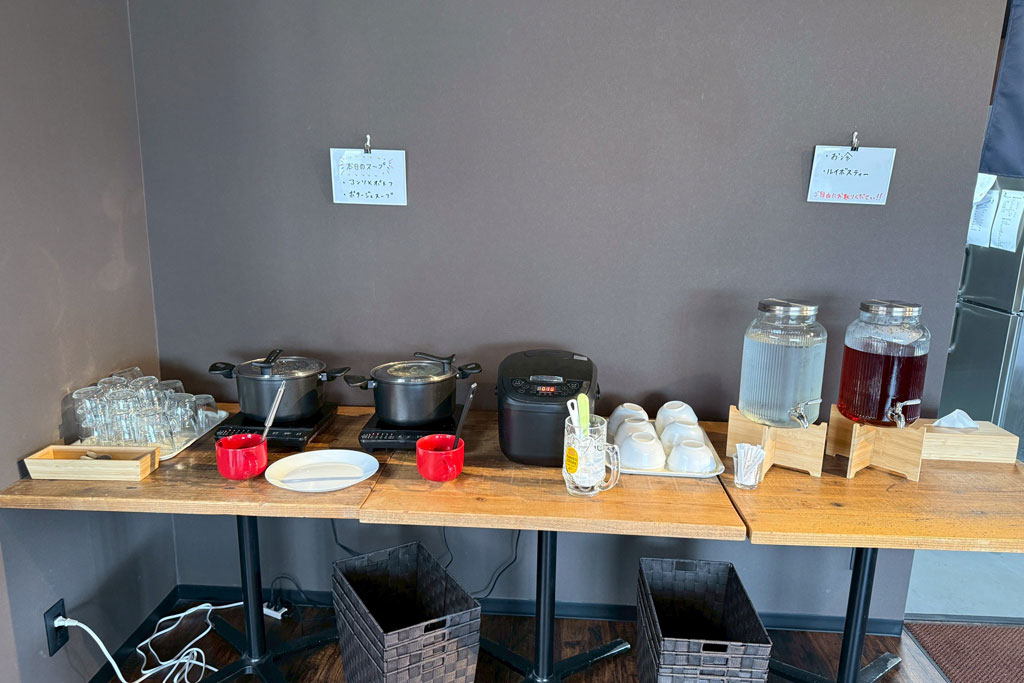 店内には、ごはんやスープを自分でつぐセルフコーナーが用意されています。スープは2種類から選べ、好きなタイミングでおかわりできるので、食べる量を調整しながら楽しめるのもうれしいポイント。