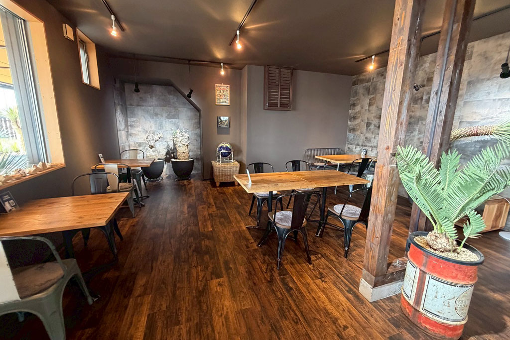 ダークトーンでまとめられた落ち着いた店内。木のテーブルや床の温かみと、グレーの壁が合わさった大人っぽい雰囲気です。