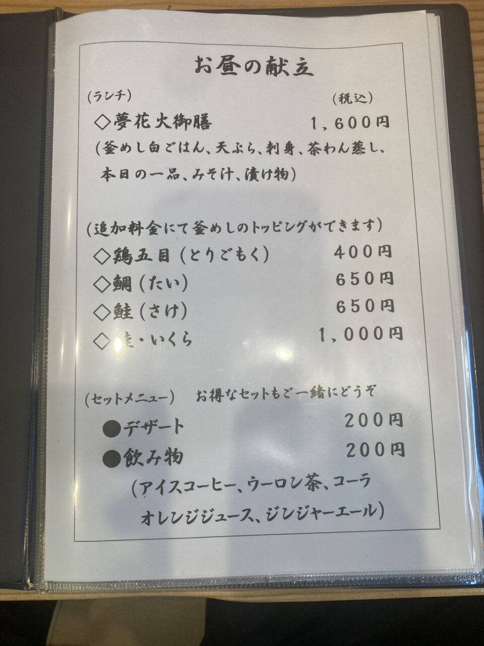 ランチメニューは夢花火御膳(1,600円)のみですが追加で釜めしのトッピングが出来るシステムになっています。