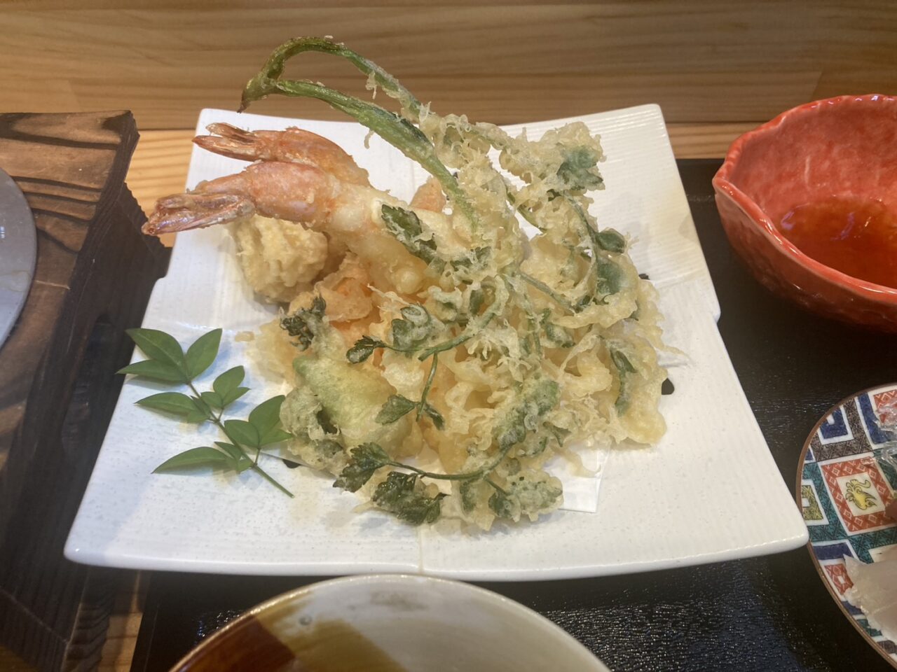 羽釜で炊き上げたふっくらご飯と、旬の食材を使った和食が楽しめ、特に天婦羅がお気に入りで衣は驚くほど軽く、油っぽさを感じないサクッとした食感。噛むたびに素材の甘みがふわりと広がり、特に海老が印象的でした。
