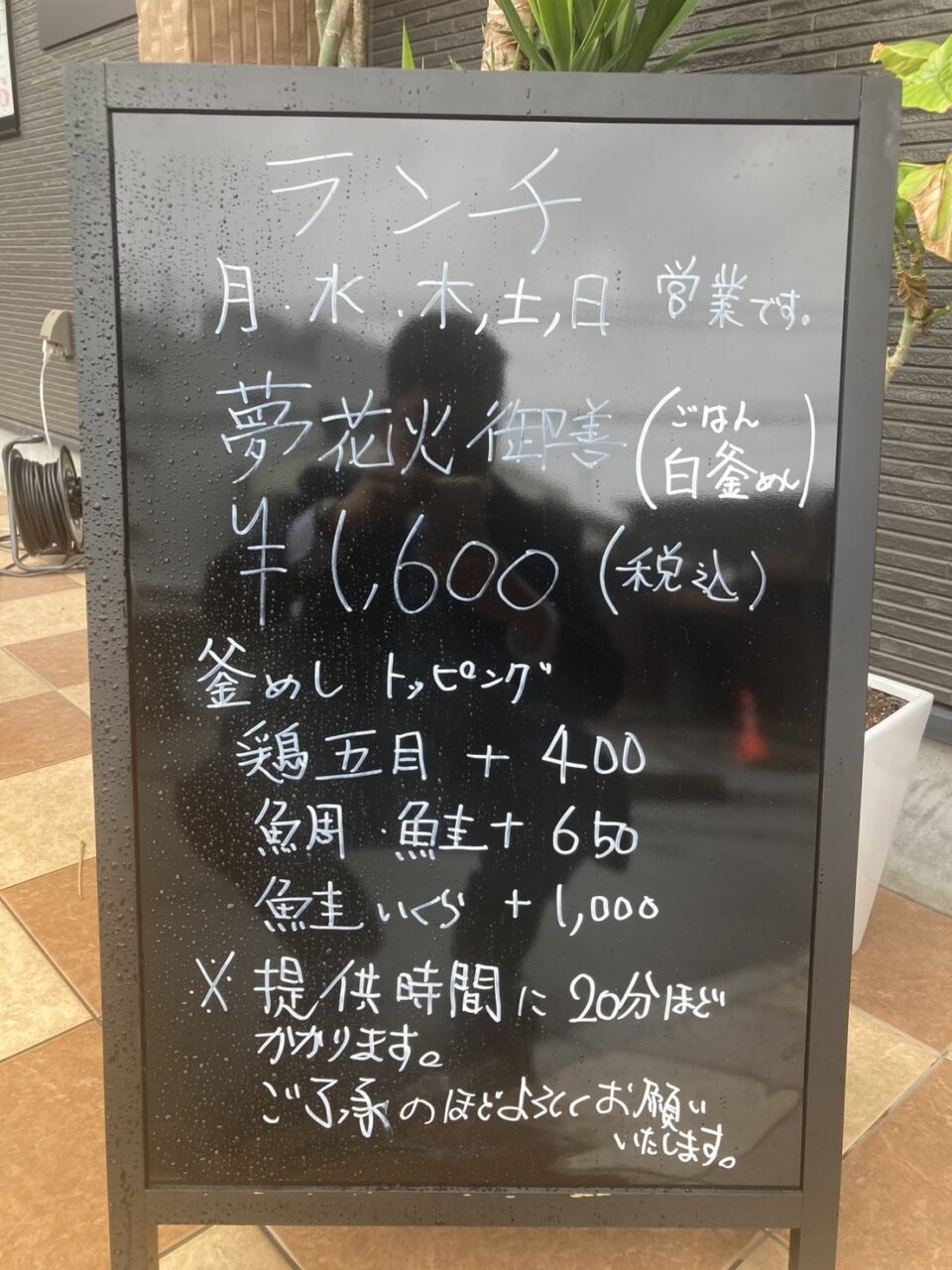 ランチメニューは夢花火御膳(1,600円)のみですが追加で釜めしのトッピングが出来るシステムになっています。