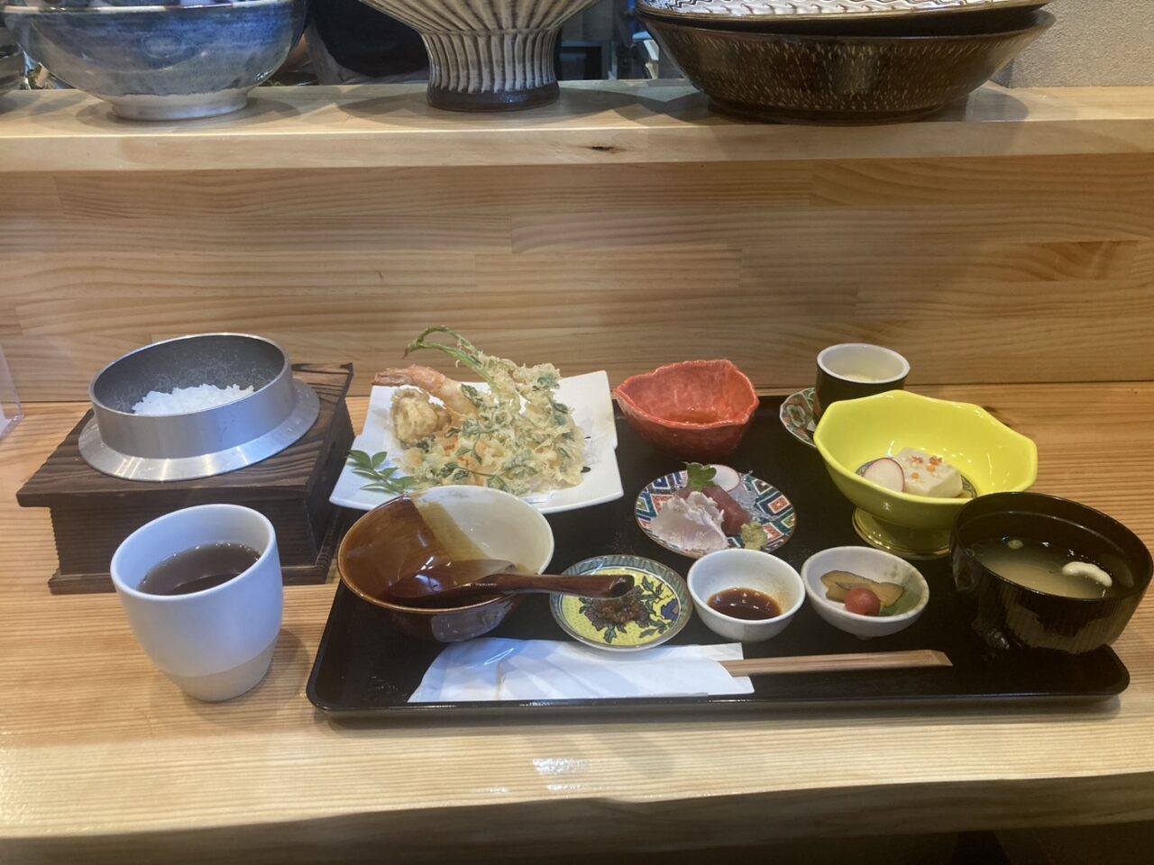 羽釜で炊き上げたふっくらご飯と、旬の食材を使った和食が楽しめ、特に天婦羅がお気に入りで衣は驚くほど軽く、油っぽさを感じないサクッとした食感。噛むたびに素材の甘みがふわりと広がり、特に海老が印象的でした。
