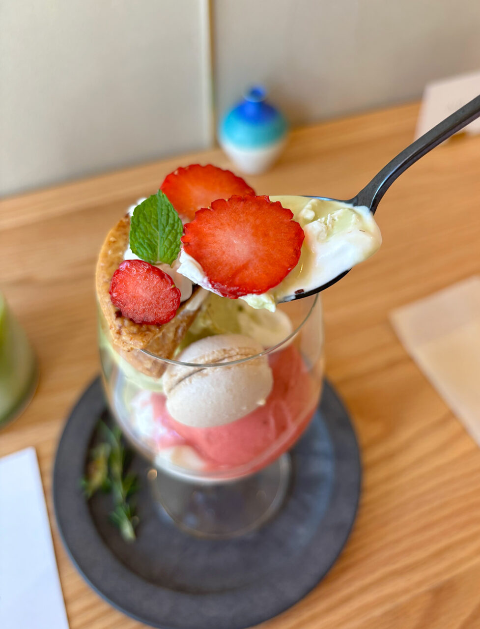 1日20杯限定の月替わりパフェは、ひとつのグラスの中に全12種類もの素材が重なり合う、まさに“食べるアート”。