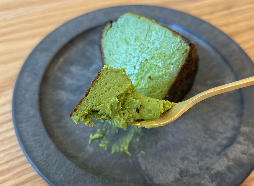 スタッフオススメの福岡県八女抹茶を贅沢に使用した「八女抹茶バスクチーズケーキ」。