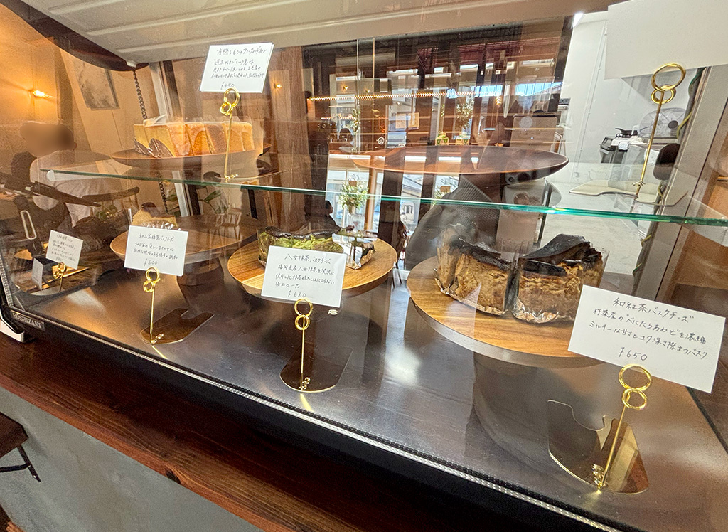 ショーケースに並ぶスイーツは、バスクチーズケーキや抹茶、和紅茶などを使った焼き菓子が並び、どれも素朴でありながら上品な佇まい。
