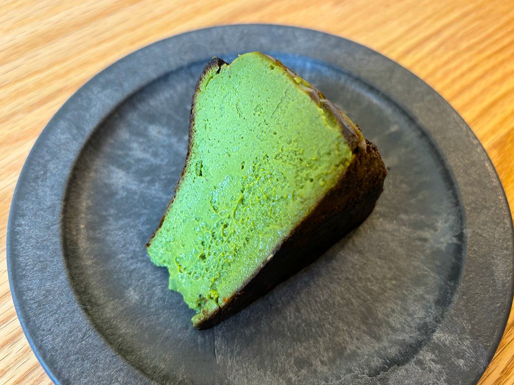 スタッフオススメの福岡県八女抹茶を贅沢に使用した「八女抹茶バスクチーズケーキ」。