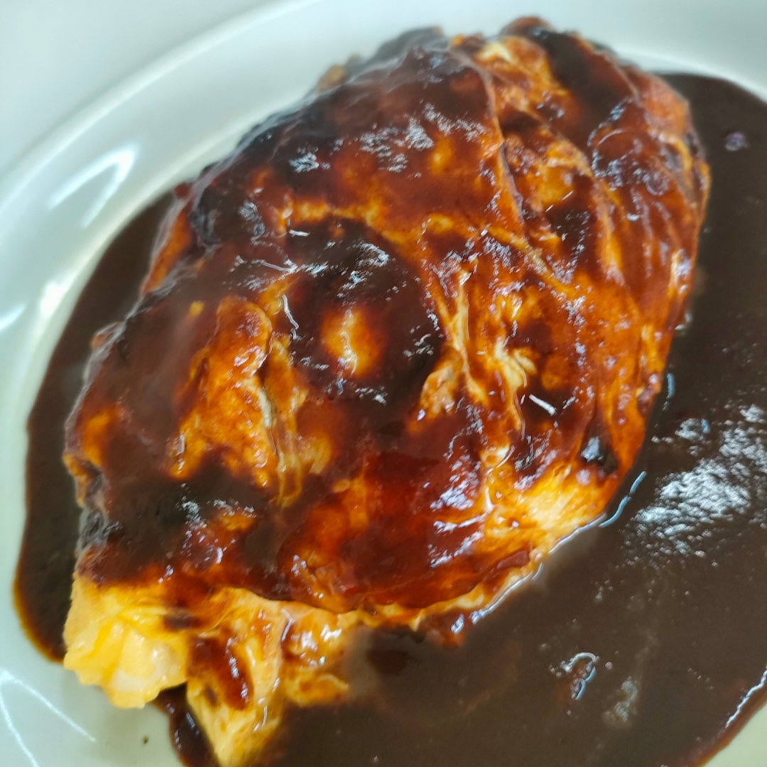 薄焼き卵で包むクラシックタイプで、その名の通り卵がふんわりとろとろで口当たりが良く、また自家製のデミグラスソースと相まって、食べるた度に思わずニンマリしてしまいます。
