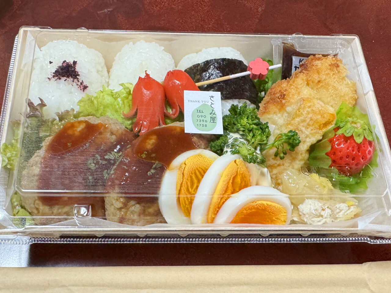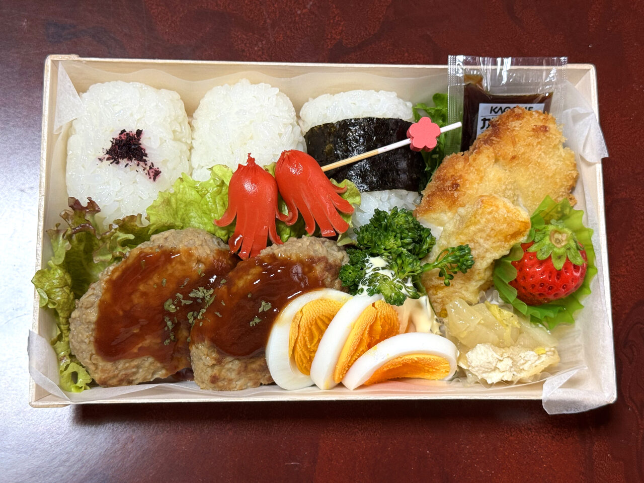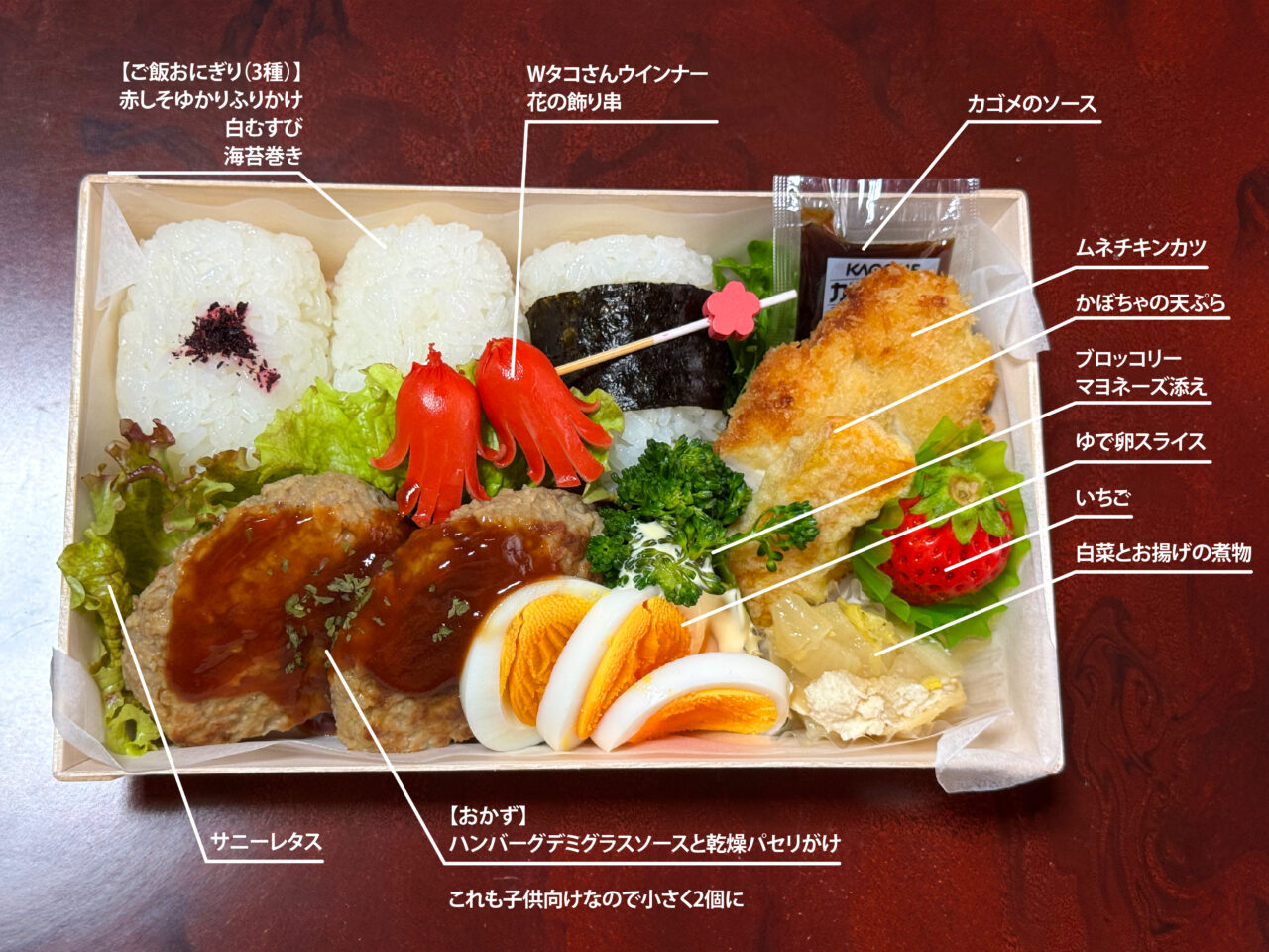3種おにぎりに、ハンバーグやチキンカツ、タコさんウインナー、天ぷら、煮物、いちごのデザート。小さく工夫されたサイズ感で食べやすく、見た目も楽しい王道メニューがぎゅっと詰まっています。ピックがあるので、大人と一緒に食べるか事前に確認する配慮も◎