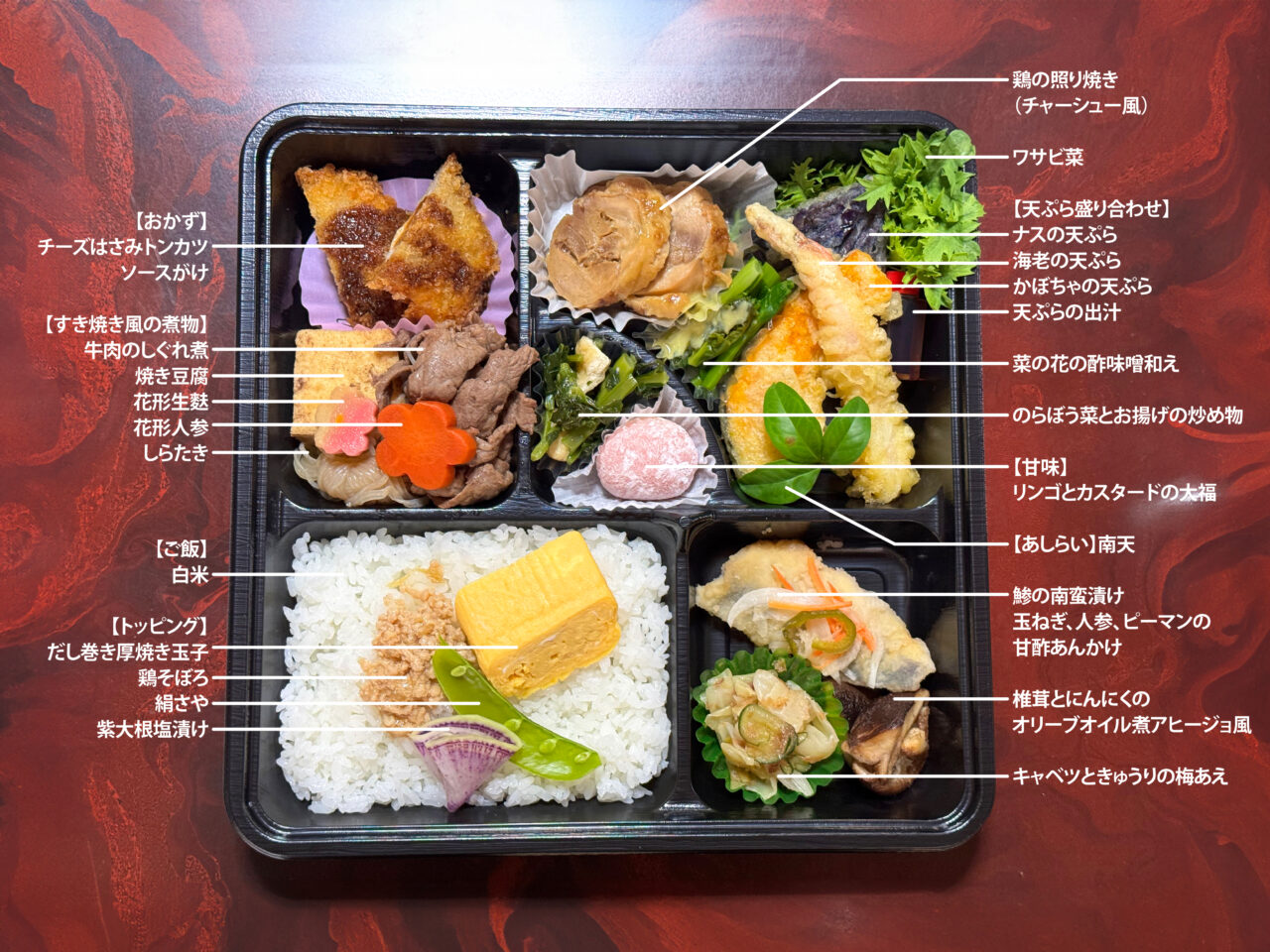 メイン級のおかずがずらり。チーズはさみトンカツ、牛しぐれ煮入りのすき焼き風煮物、鶏の照り焼き、海老・かぼちゃ・ナスの天ぷら、鯵の南蛮漬け、のらぼう菜炒め…。さらに、肉厚椎茸のアヒージョ風や菜の花の酢味噌和えなど野菜料理も充実。白米には鶏そぼろやだし巻き玉子が彩りを添え、甘味にはリンゴとカスタードの大福。肉・魚・野菜・揚げ物・煮物・甘味まで揃う、満足度の高い内容です。