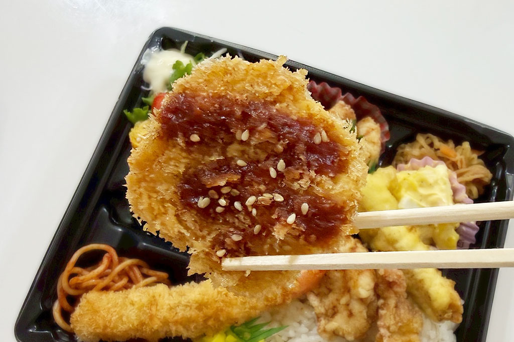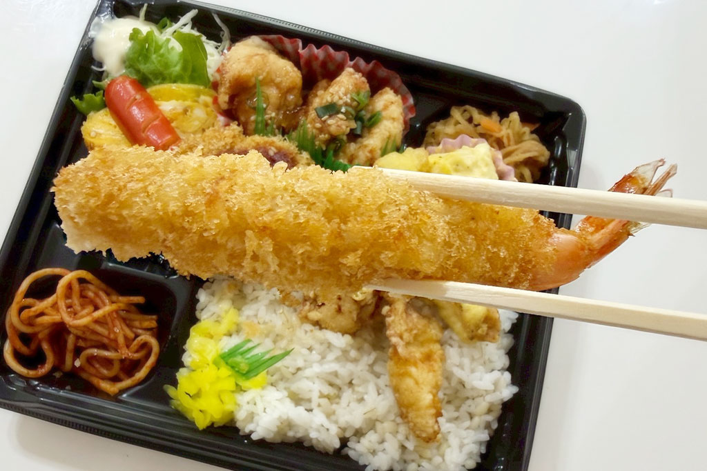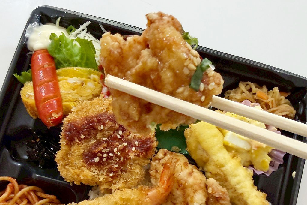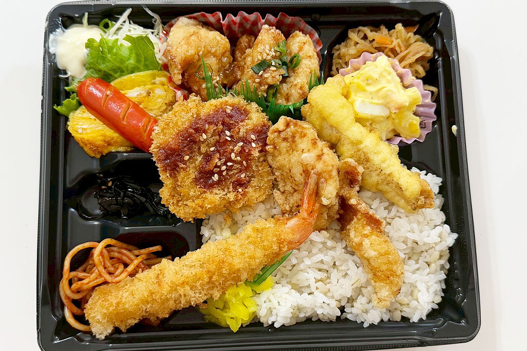 えびフライ・からあげ・チキンカツに加え、日替わりのおかずも楽しめる満足感のある内容。
