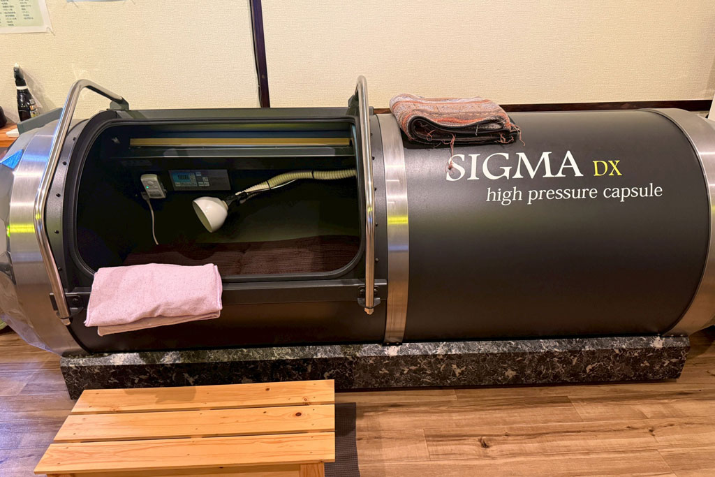 店内には、高気圧の酸素カプセルルームも併設されています。リラックスしたいときや、日々の疲れを感じたときなどに利用できる設備で、食事とあわせて気軽に立ち寄れます。