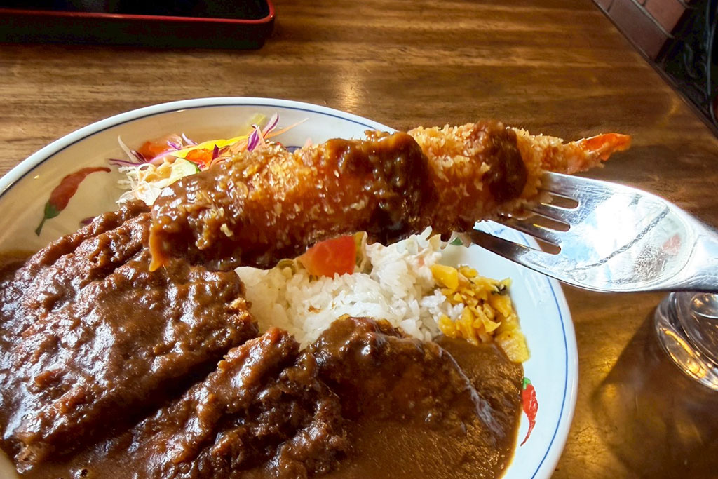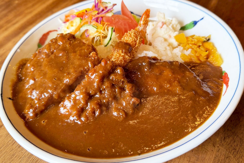 ひと目でインパクトを感じるキングカレー 1,500円は、トンカツ・エビフライ・ハンバーグが贅沢に盛られたボリューム満点の一皿。
