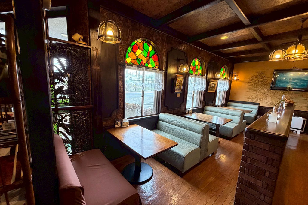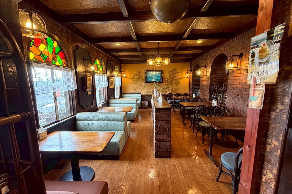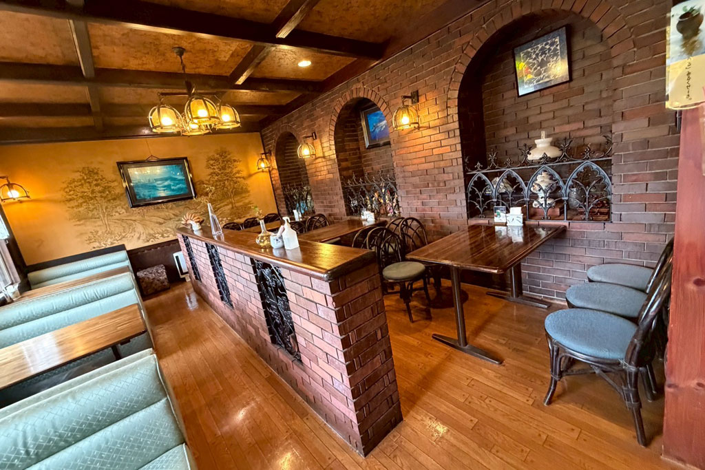 やわらかな照明に包まれた店内は、どこか懐かしさを感じる落ち着いた空間。木のぬくもりが伝わるテーブルやレンガ調の壁、ゆったり座れるソファ席など、昔ながらの喫茶店らしい雰囲気が広がります。