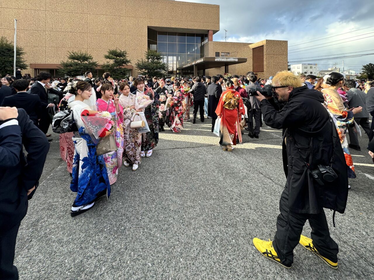 会場に一歩入ると、色鮮やかな振袖や凛とした袴、スタイリッシュなスーツ姿が並び、空気は一気に華やぎます。友人同士で写真を撮り合い、久しぶりの再会に笑顔が弾む様子は、この日ならではの光景。撮影中も「撮ってください」「みんなで一緒に!」と声をかけてくれる姿から、素直で前向きなエネルギーが伝わってきました。