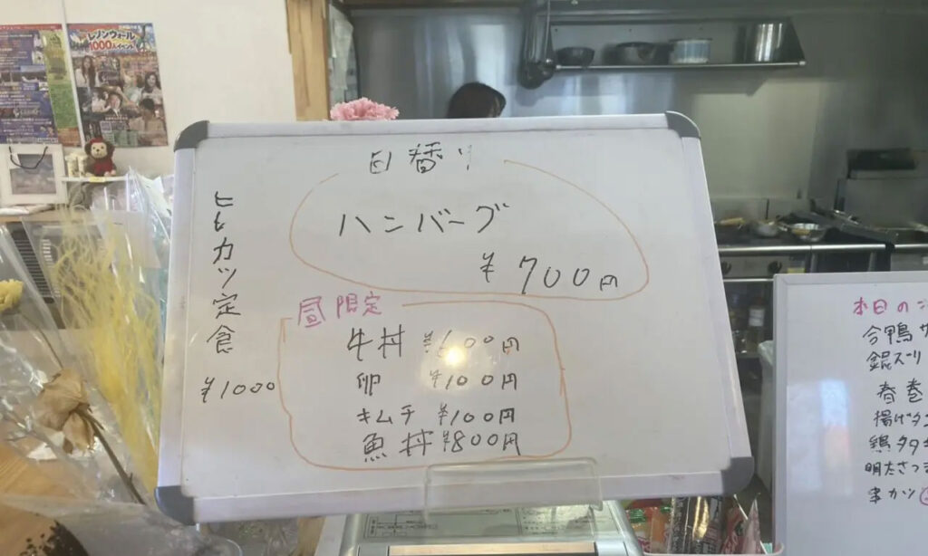 定番の定食からうどんやカレー、ハンバーグまで幅広いメニューが揃い、どれも家庭的で親しみやすい味わい。なかでも人気の日替わり定食は、小鉢が充実しコストパフォーマンスも抜群で、ランチタイムには多くの常連客で賑わいます。